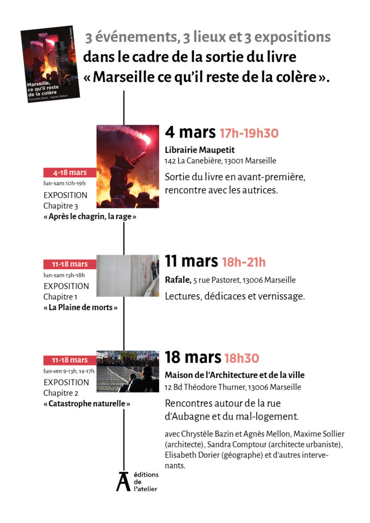 Bienvenue sur la page ressources du livre “Marseille, ce qu’il reste de la colère”, vous y trouverez les créations sonores et les vidéos issue de l’exposition “la dent creuse, cartographie de la colère” ainsi que les actualités du livre.